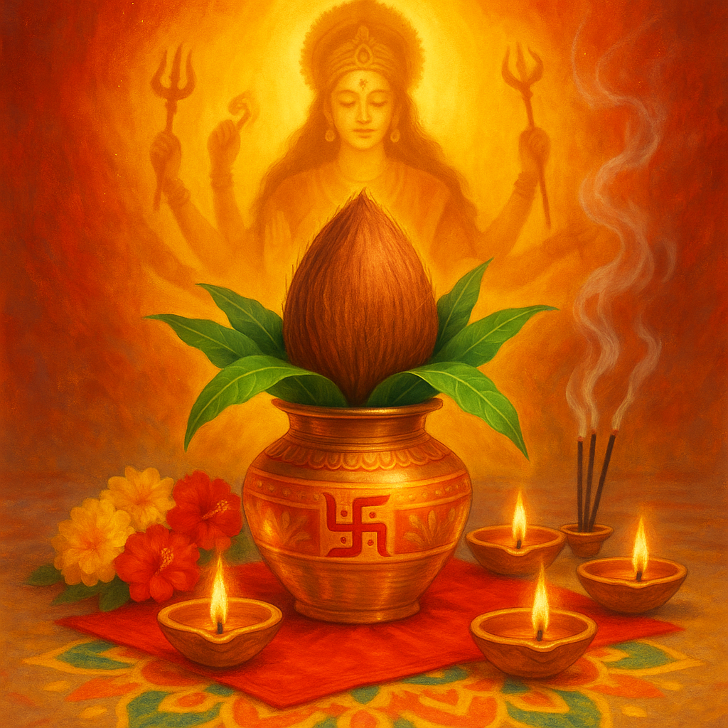 - कलश स्थापना – शुद्ध स्थान पर कलश रखें, नारियल और आम्रपल्लव चढ़ाएं।